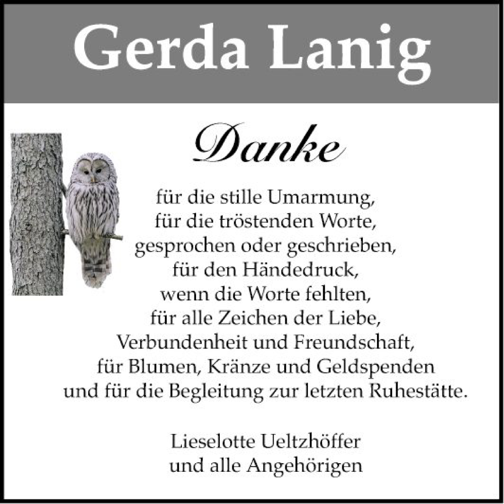 Hier finden Sie alle Traueranzeigen aus der Zeitung, die bisher für Gerda Lanig erschienen sind. Weitere Traueranzeigen, die in der Zeitung erscheinen, werden hier ebenfalls aufgelistet