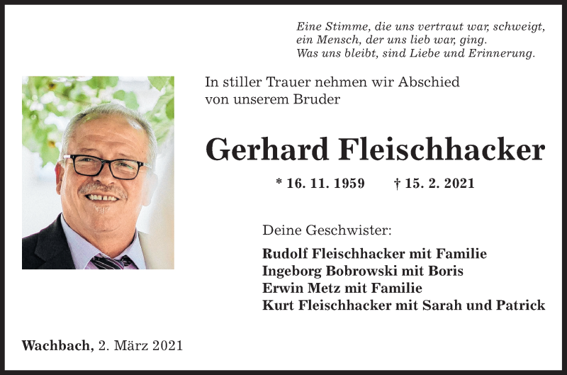 Hier finden Sie alle Traueranzeigen aus der Zeitung, die bisher für Gerhard Fleischhacker erschienen sind. Weitere Traueranzeigen, die in der Zeitung erscheinen, werden hier ebenfalls aufgelistet