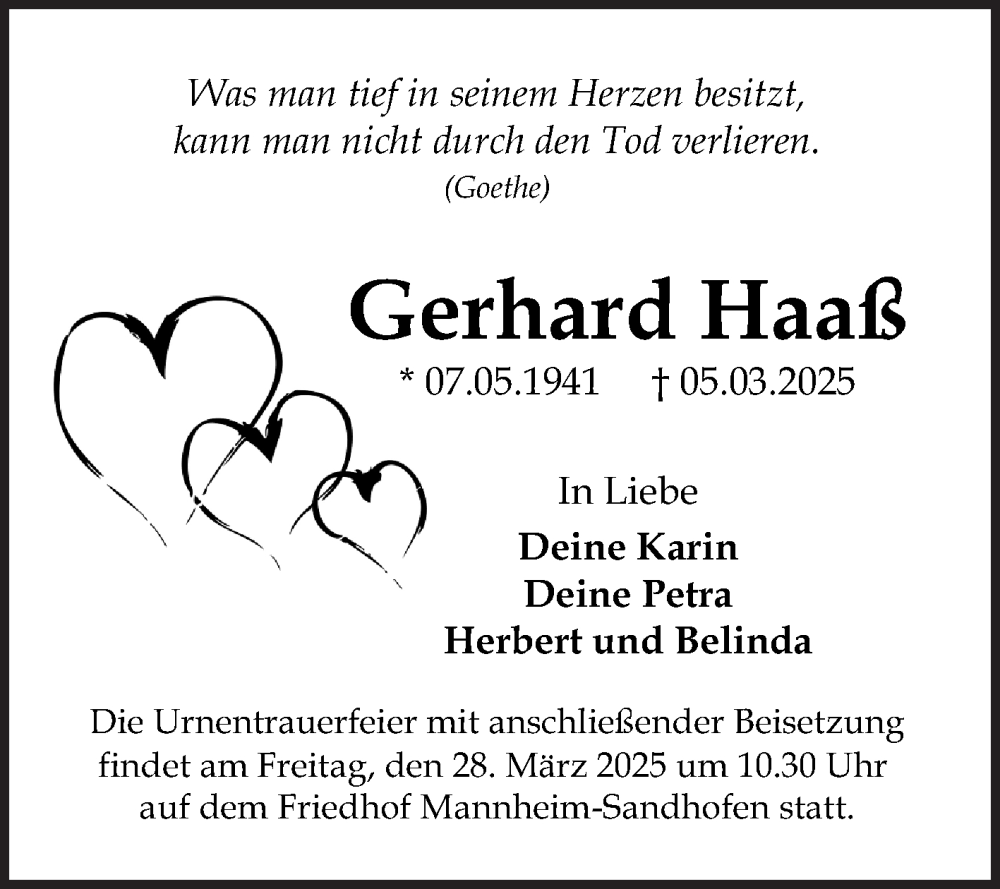 Hier finden Sie alle Traueranzeigen aus der Zeitung, die bisher für Gerhard Haaß erschienen sind. Weitere Traueranzeigen, die in der Zeitung erscheinen, werden hier ebenfalls aufgelistet