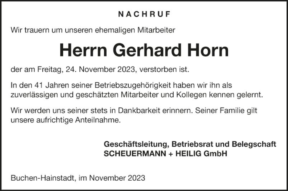 Hier finden Sie alle Traueranzeigen aus der Zeitung, die bisher für Gerhard Horn erschienen sind. Weitere Traueranzeigen, die in der Zeitung erscheinen, werden hier ebenfalls aufgelistet