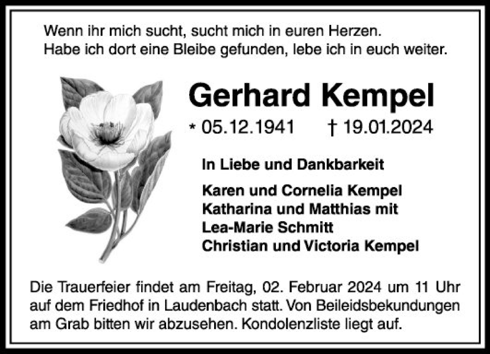 Hier finden Sie alle Traueranzeigen aus der Zeitung, die bisher für Gerhard Kempel erschienen sind. Weitere Traueranzeigen, die in der Zeitung erscheinen, werden hier ebenfalls aufgelistet