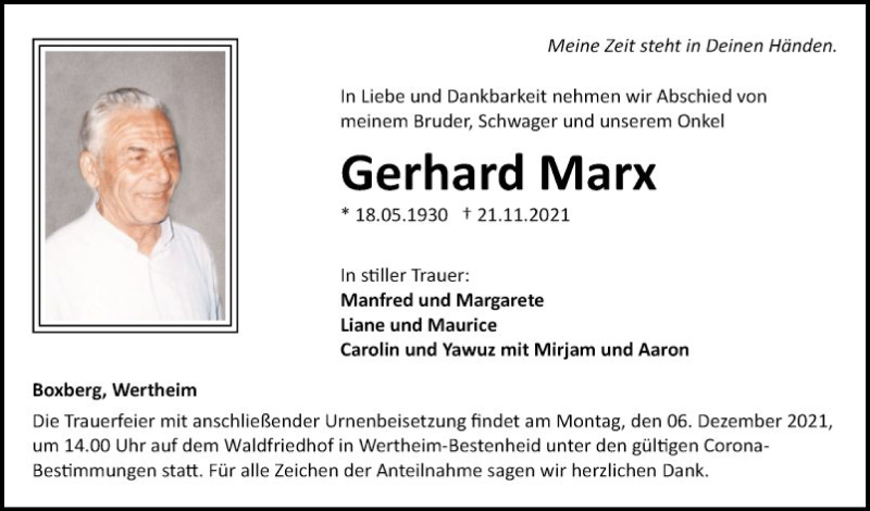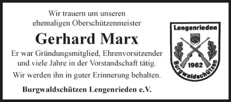 Hier finden Sie alle Traueranzeigen aus der Zeitung, die bisher für Gerhard Marx erschienen sind. Weitere Traueranzeigen, die in der Zeitung erscheinen, werden hier ebenfalls aufgelistet