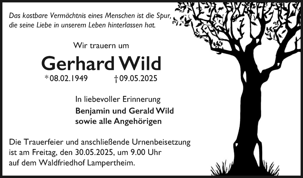 Hier finden Sie alle Traueranzeigen aus der Zeitung, die bisher für Gerhard Wild erschienen sind. Weitere Traueranzeigen, die in der Zeitung erscheinen, werden hier ebenfalls aufgelistet