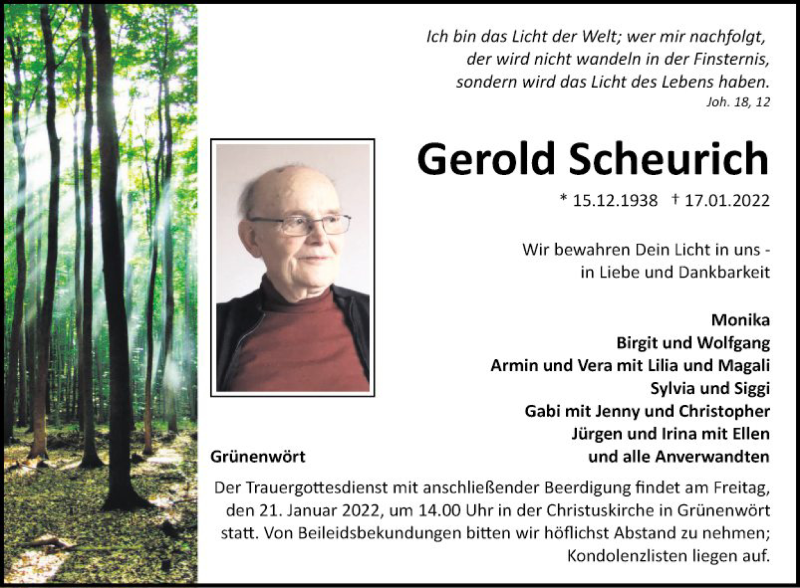 Hier finden Sie alle Traueranzeigen aus der Zeitung, die bisher für Gerold Scheurich erschienen sind. Weitere Traueranzeigen, die in der Zeitung erscheinen, werden hier ebenfalls aufgelistet