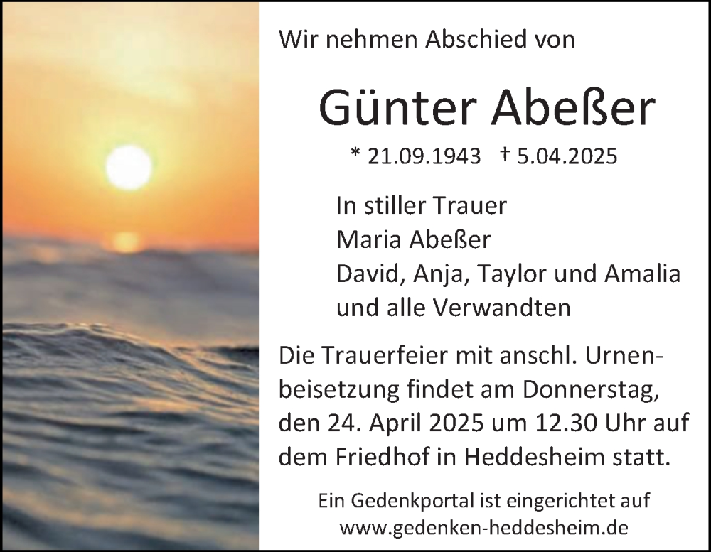 Hier finden Sie alle Traueranzeigen aus der Zeitung, die bisher für Günter Abeßer erschienen sind. Weitere Traueranzeigen, die in der Zeitung erscheinen, werden hier ebenfalls aufgelistet