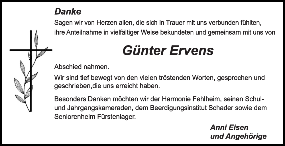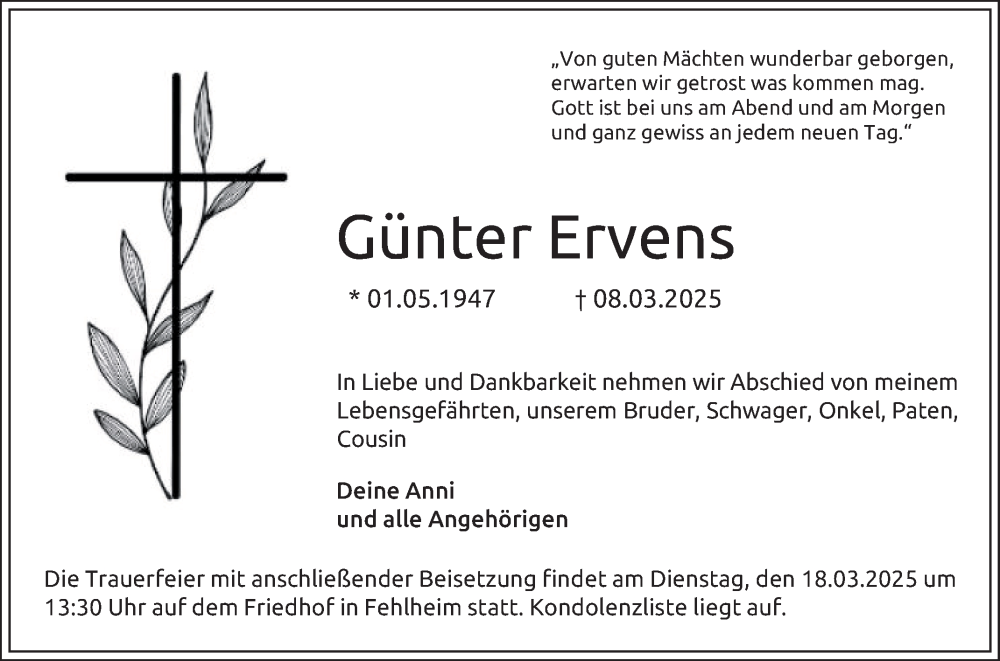 Hier finden Sie alle Traueranzeigen aus der Zeitung, die bisher für Günter Ervens erschienen sind. Weitere Traueranzeigen, die in der Zeitung erscheinen, werden hier ebenfalls aufgelistet