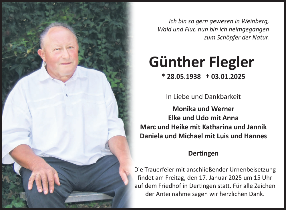 Hier finden Sie alle Traueranzeigen aus der Zeitung, die bisher für Günther Flegler erschienen sind. Weitere Traueranzeigen, die in der Zeitung erscheinen, werden hier ebenfalls aufgelistet