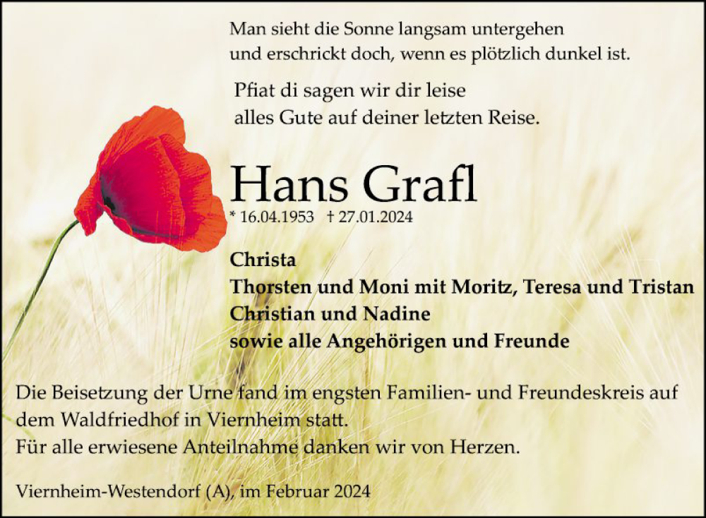 Hier finden Sie alle Traueranzeigen aus der Zeitung, die bisher für Hans Grafl erschienen sind. Weitere Traueranzeigen, die in der Zeitung erscheinen, werden hier ebenfalls aufgelistet