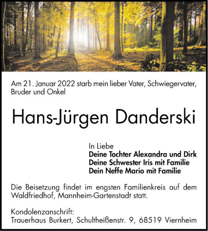 Hier finden Sie alle Traueranzeigen aus der Zeitung, die bisher für Hans-Jürgen Danderski erschienen sind. Weitere Traueranzeigen, die in der Zeitung erscheinen, werden hier ebenfalls aufgelistet