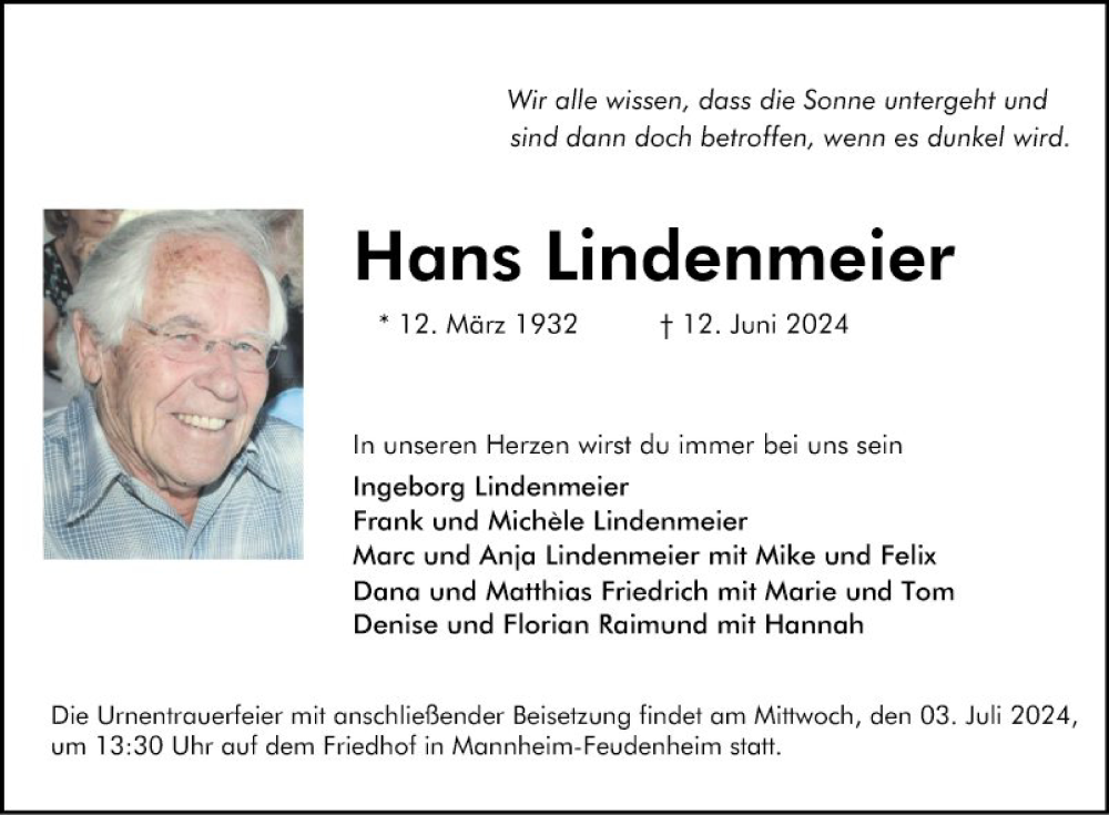 Hier finden Sie alle Traueranzeigen aus der Zeitung, die bisher für Hans Lindenmeier erschienen sind. Weitere Traueranzeigen, die in der Zeitung erscheinen, werden hier ebenfalls aufgelistet