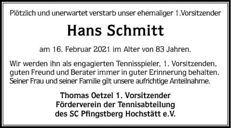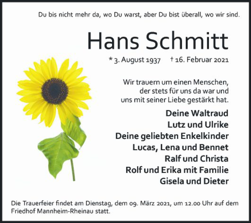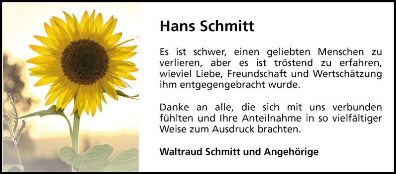 Hier finden Sie alle Traueranzeigen aus der Zeitung, die bisher für Hans Schmitt erschienen sind. Weitere Traueranzeigen, die in der Zeitung erscheinen, werden hier ebenfalls aufgelistet