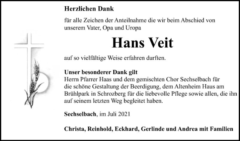 Hier finden Sie alle Traueranzeigen aus der Zeitung, die bisher für Hans Veit erschienen sind. Weitere Traueranzeigen, die in der Zeitung erscheinen, werden hier ebenfalls aufgelistet