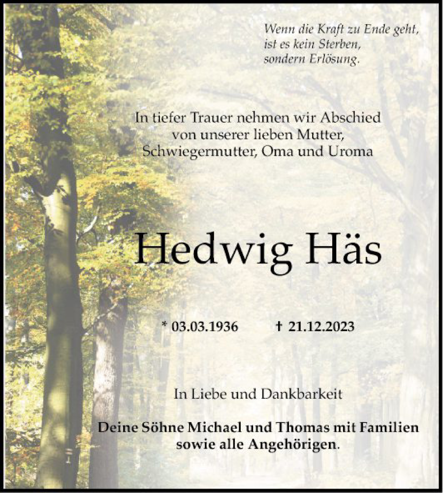 Hier finden Sie alle Traueranzeigen aus der Zeitung, die bisher für Hedwig Häs erschienen sind. Weitere Traueranzeigen, die in der Zeitung erscheinen, werden hier ebenfalls aufgelistet