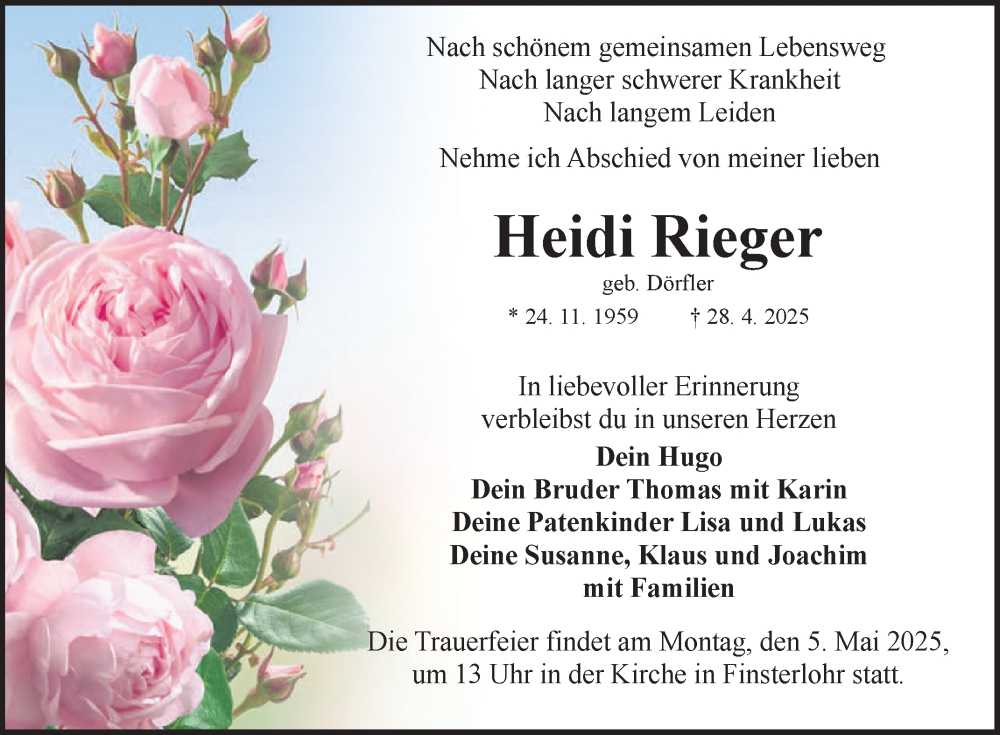 Hier finden Sie alle Traueranzeigen aus der Zeitung, die bisher für Heidi Rieger erschienen sind. Weitere Traueranzeigen, die in der Zeitung erscheinen, werden hier ebenfalls aufgelistet