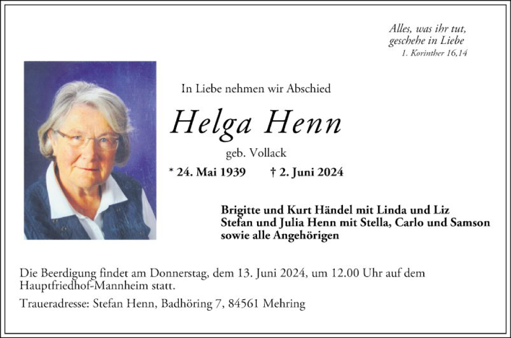 Hier finden Sie alle Traueranzeigen aus der Zeitung, die bisher für Helga Henn erschienen sind. Weitere Traueranzeigen, die in der Zeitung erscheinen, werden hier ebenfalls aufgelistet