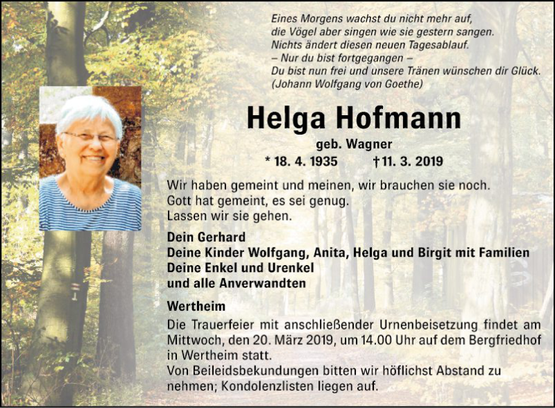 Hier finden Sie alle Traueranzeigen aus der Zeitung, die bisher für Helga Hofmann erschienen sind. Weitere Traueranzeigen, die in der Zeitung erscheinen, werden hier ebenfalls aufgelistet