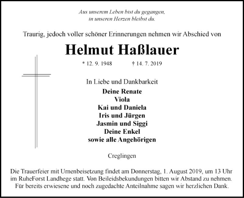Hier finden Sie alle Traueranzeigen aus der Zeitung, die bisher für Helmut Haßlauer erschienen sind. Weitere Traueranzeigen, die in der Zeitung erscheinen, werden hier ebenfalls aufgelistet
