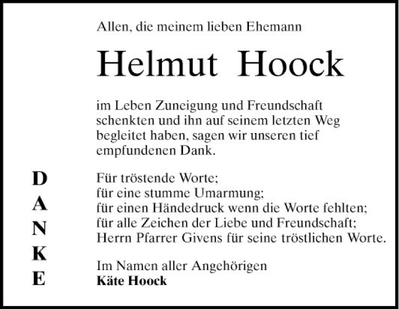 Hier finden Sie alle Traueranzeigen aus der Zeitung, die bisher für Helmut Hoock erschienen sind. Weitere Traueranzeigen, die in der Zeitung erscheinen, werden hier ebenfalls aufgelistet