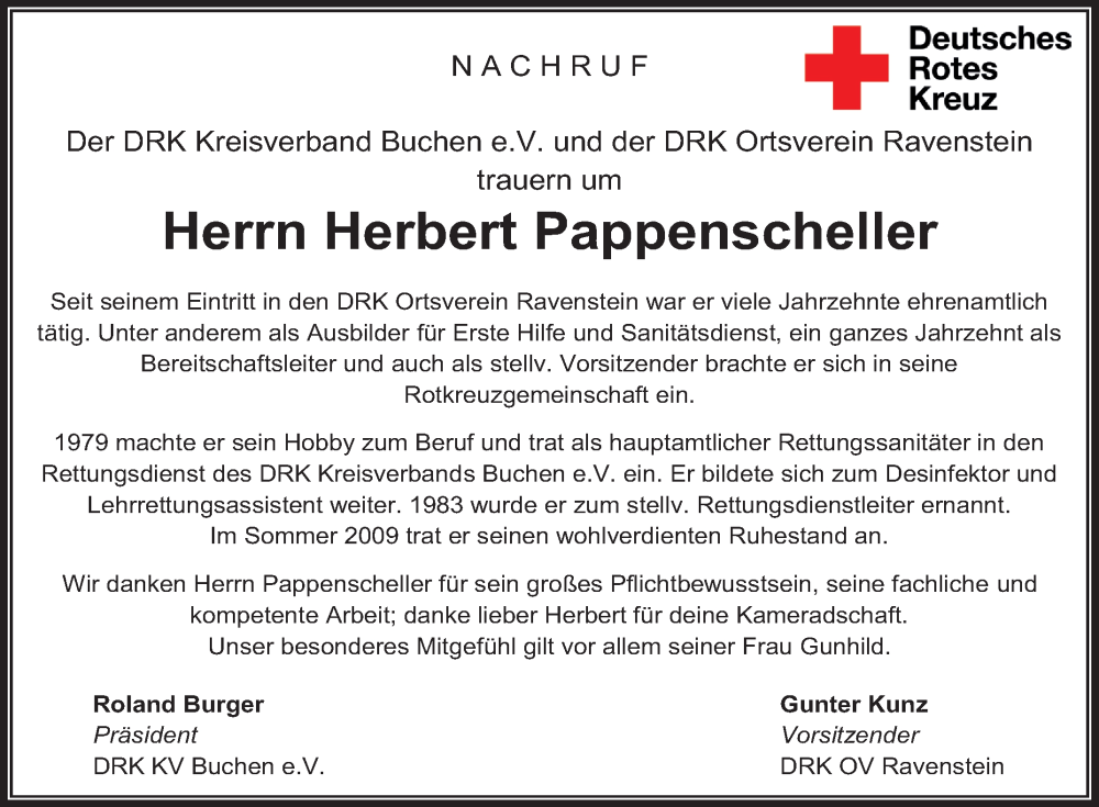 Hier finden Sie alle Traueranzeigen aus der Zeitung, die bisher für Herbert Pappenscheller erschienen sind. Weitere Traueranzeigen, die in der Zeitung erscheinen, werden hier ebenfalls aufgelistet