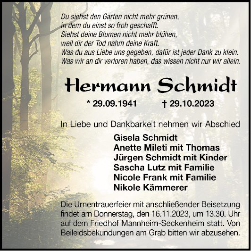 Hier finden Sie alle Traueranzeigen aus der Zeitung, die bisher für Hermann Schmidt erschienen sind. Weitere Traueranzeigen, die in der Zeitung erscheinen, werden hier ebenfalls aufgelistet