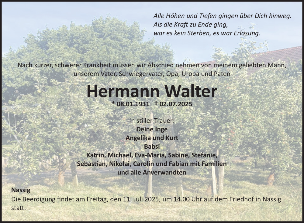 Hier finden Sie alle Traueranzeigen aus der Zeitung, die bisher für Hermann Walter erschienen sind. Weitere Traueranzeigen, die in der Zeitung erscheinen, werden hier ebenfalls aufgelistet