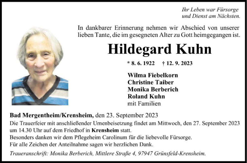 Hier finden Sie alle Traueranzeigen aus der Zeitung, die bisher für Hildegard Kuhn erschienen sind. Weitere Traueranzeigen, die in der Zeitung erscheinen, werden hier ebenfalls aufgelistet