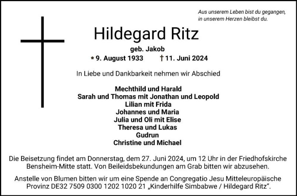 Hier finden Sie alle Traueranzeigen aus der Zeitung, die bisher für Hildegard Ritz erschienen sind. Weitere Traueranzeigen, die in der Zeitung erscheinen, werden hier ebenfalls aufgelistet