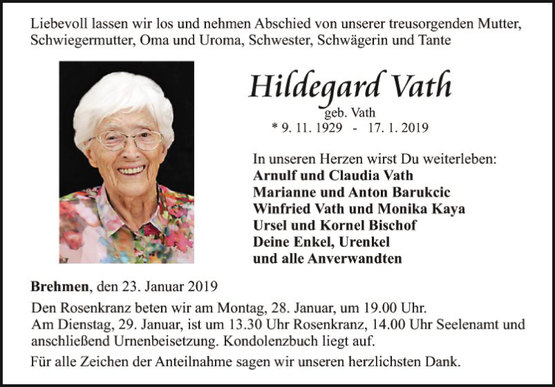 Hier finden Sie alle Traueranzeigen aus der Zeitung, die bisher für Hildegard Vath erschienen sind. Weitere Traueranzeigen, die in der Zeitung erscheinen, werden hier ebenfalls aufgelistet