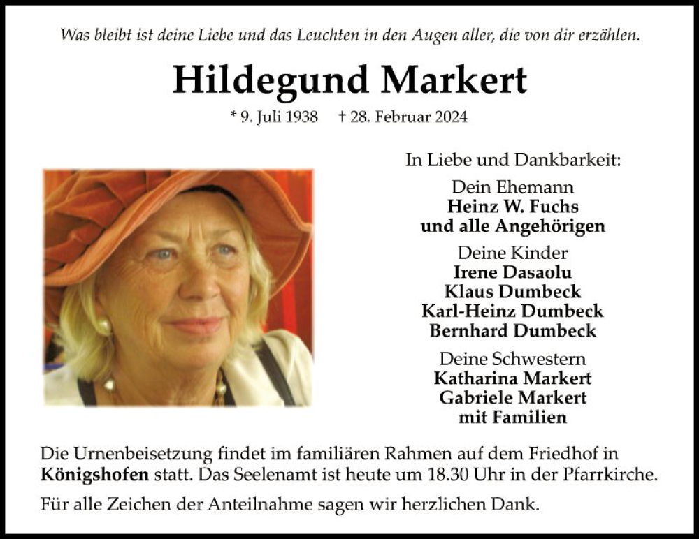 Hier finden Sie alle Traueranzeigen aus der Zeitung, die bisher für Hildegund Markert erschienen sind. Weitere Traueranzeigen, die in der Zeitung erscheinen, werden hier ebenfalls aufgelistet