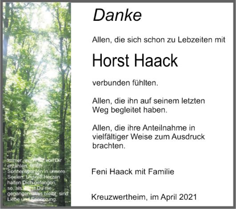 Hier finden Sie alle Traueranzeigen aus der Zeitung, die bisher für Horst Haack erschienen sind. Weitere Traueranzeigen, die in der Zeitung erscheinen, werden hier ebenfalls aufgelistet