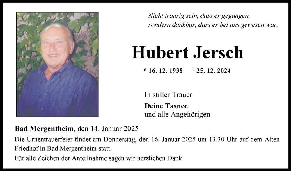 Hier finden Sie alle Traueranzeigen aus der Zeitung, die bisher für Hubert Jersch erschienen sind. Weitere Traueranzeigen, die in der Zeitung erscheinen, werden hier ebenfalls aufgelistet