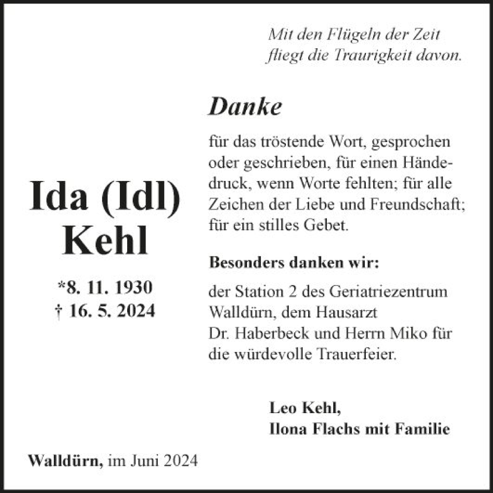 Hier finden Sie alle Traueranzeigen aus der Zeitung, die bisher für Ida Kehl erschienen sind. Weitere Traueranzeigen, die in der Zeitung erscheinen, werden hier ebenfalls aufgelistet