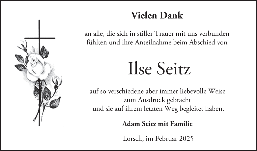 Hier finden Sie alle Traueranzeigen aus der Zeitung, die bisher für Ilse Seitz erschienen sind. Weitere Traueranzeigen, die in der Zeitung erscheinen, werden hier ebenfalls aufgelistet