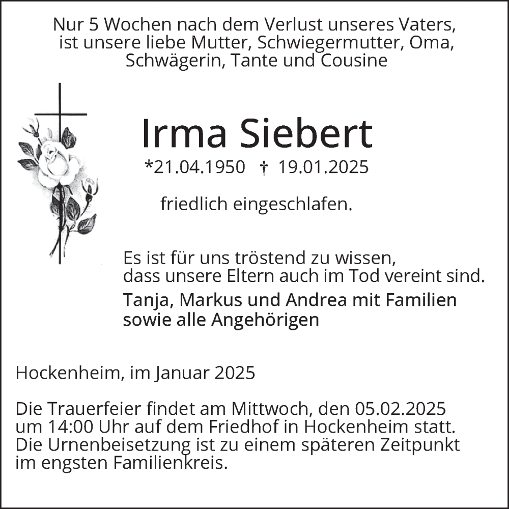 Hier finden Sie alle Traueranzeigen aus der Zeitung, die bisher für Irma Siebert erschienen sind. Weitere Traueranzeigen, die in der Zeitung erscheinen, werden hier ebenfalls aufgelistet