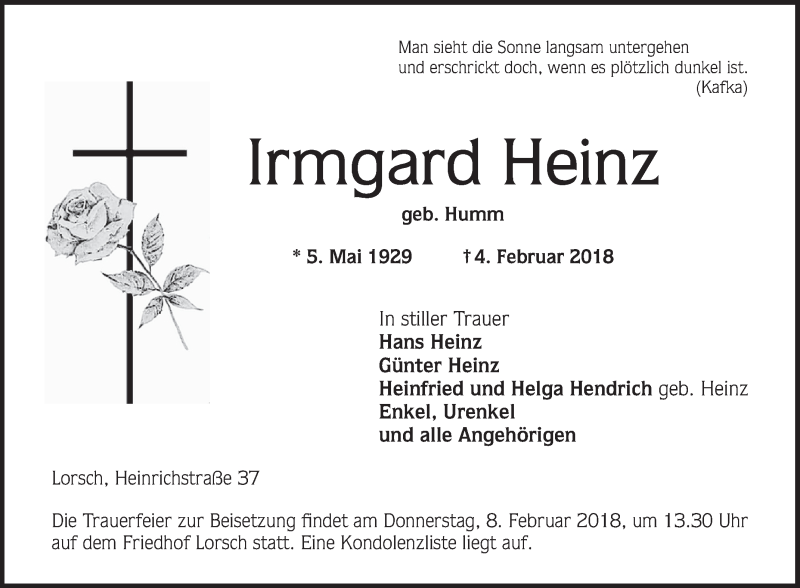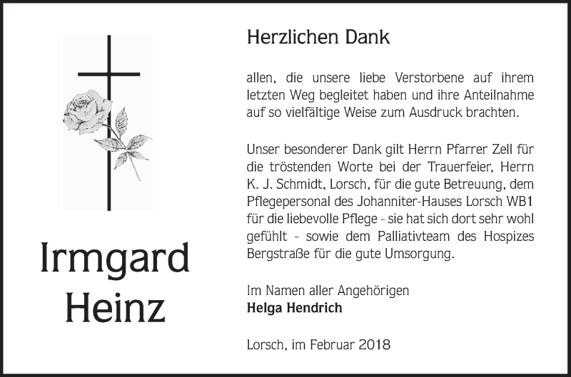 Hier finden Sie alle Traueranzeigen aus der Zeitung, die bisher für Irmgard Heinz erschienen sind. Weitere Traueranzeigen, die in der Zeitung erscheinen, werden hier ebenfalls aufgelistet