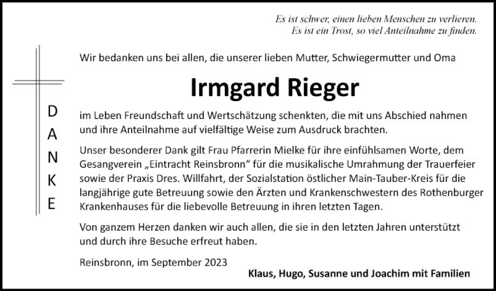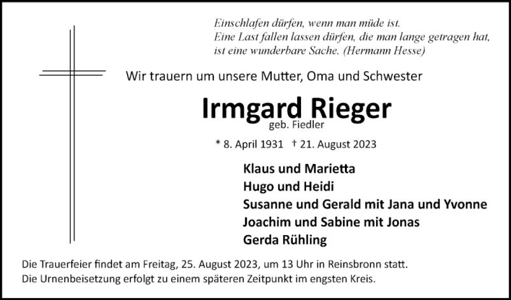 Hier finden Sie alle Traueranzeigen aus der Zeitung, die bisher für Irmgard Rieger erschienen sind. Weitere Traueranzeigen, die in der Zeitung erscheinen, werden hier ebenfalls aufgelistet