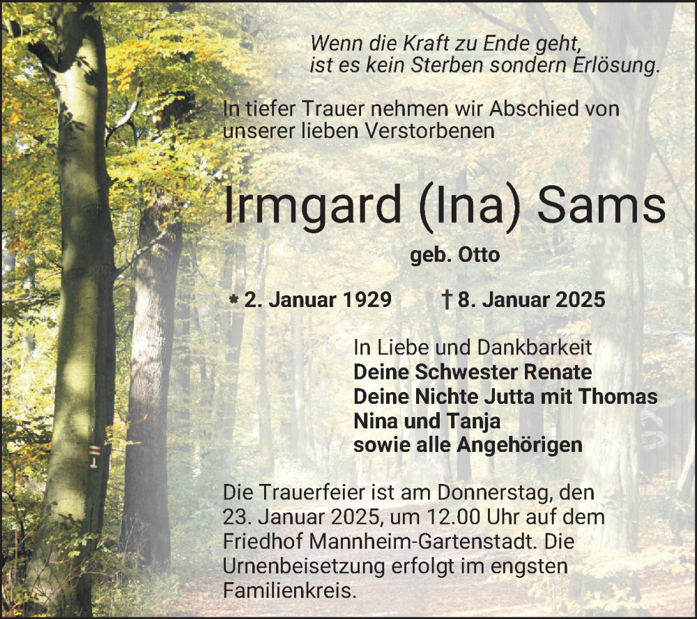 Hier finden Sie alle Traueranzeigen aus der Zeitung, die bisher für Irmgard Sams erschienen sind. Weitere Traueranzeigen, die in der Zeitung erscheinen, werden hier ebenfalls aufgelistet