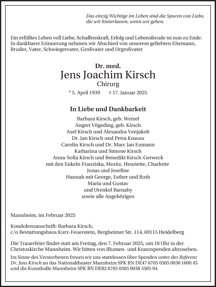 Hier finden Sie alle Traueranzeigen aus der Zeitung, die bisher für Jens Joachim Kirsch erschienen sind. Weitere Traueranzeigen, die in der Zeitung erscheinen, werden hier ebenfalls aufgelistet