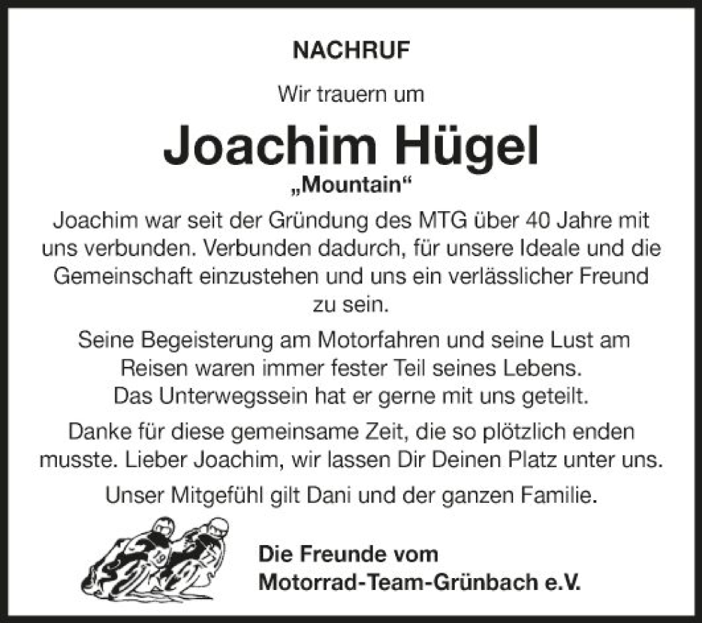 Hier finden Sie alle Traueranzeigen aus der Zeitung, die bisher für Joachim Hügel erschienen sind. Weitere Traueranzeigen, die in der Zeitung erscheinen, werden hier ebenfalls aufgelistet