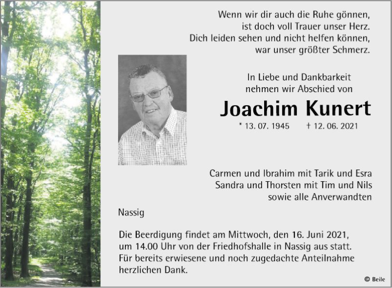 Hier finden Sie alle Traueranzeigen aus der Zeitung, die bisher für Joachim Kunert erschienen sind. Weitere Traueranzeigen, die in der Zeitung erscheinen, werden hier ebenfalls aufgelistet