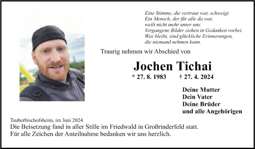 Hier finden Sie alle Traueranzeigen aus der Zeitung, die bisher für Jochen Tichai erschienen sind. Weitere Traueranzeigen, die in der Zeitung erscheinen, werden hier ebenfalls aufgelistet