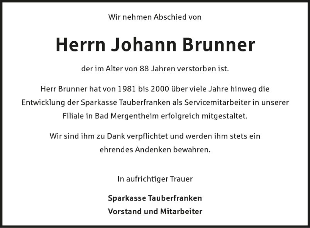 Hier finden Sie alle Traueranzeigen aus der Zeitung, die bisher für Johann Brunner erschienen sind. Weitere Traueranzeigen, die in der Zeitung erscheinen, werden hier ebenfalls aufgelistet