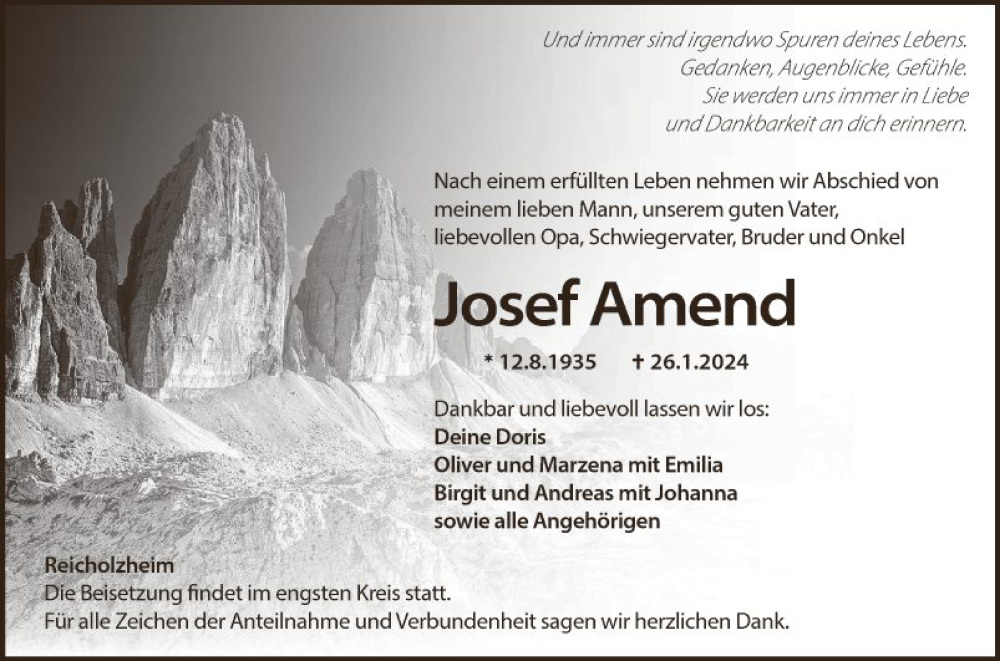 Hier finden Sie alle Traueranzeigen aus der Zeitung, die bisher für Josef Amend erschienen sind. Weitere Traueranzeigen, die in der Zeitung erscheinen, werden hier ebenfalls aufgelistet