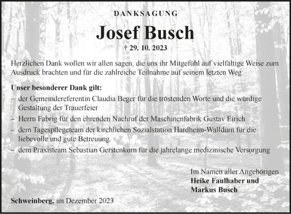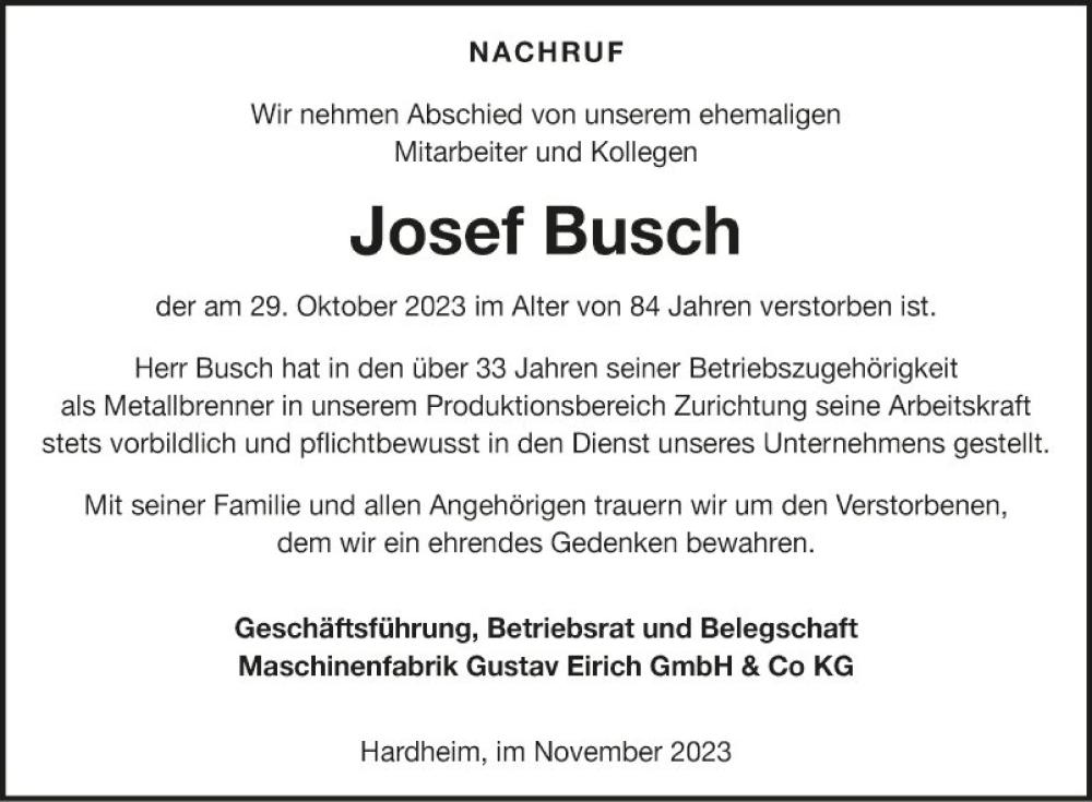 Hier finden Sie alle Traueranzeigen aus der Zeitung, die bisher für Josef Busch erschienen sind. Weitere Traueranzeigen, die in der Zeitung erscheinen, werden hier ebenfalls aufgelistet