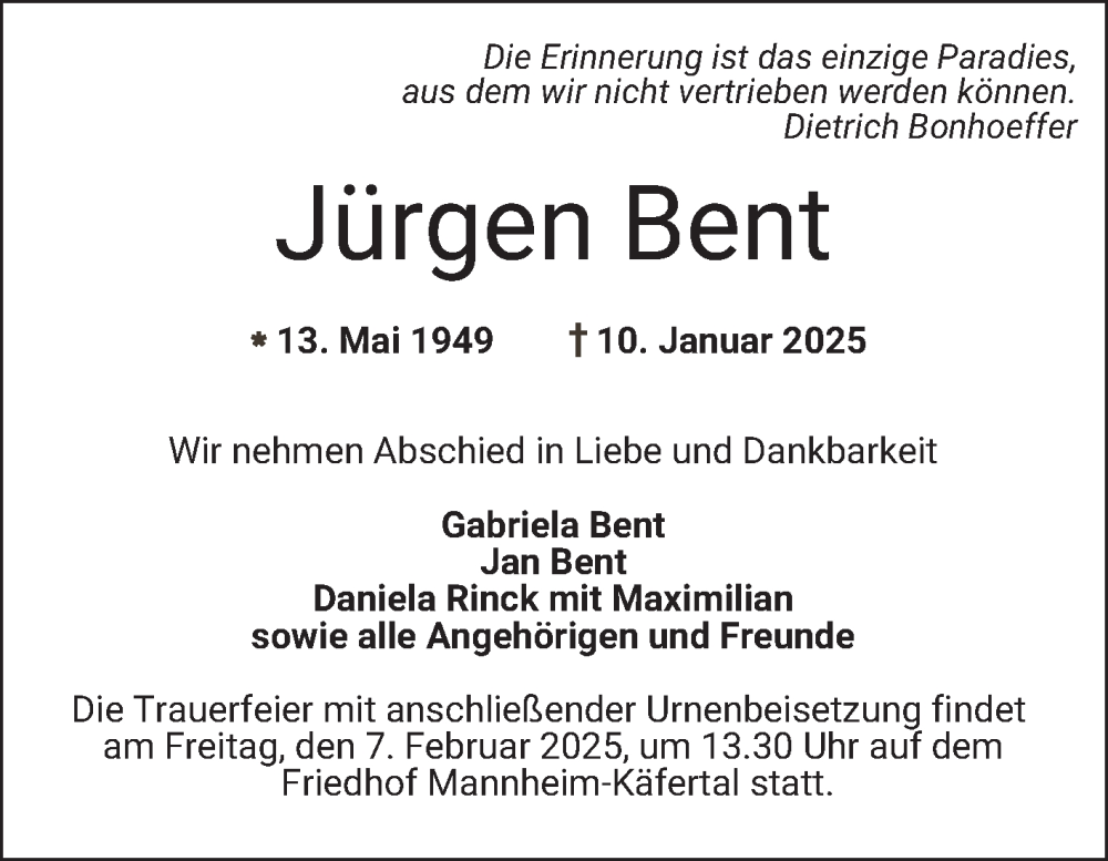 Hier finden Sie alle Traueranzeigen aus der Zeitung, die bisher für Jürgen Bent erschienen sind. Weitere Traueranzeigen, die in der Zeitung erscheinen, werden hier ebenfalls aufgelistet
