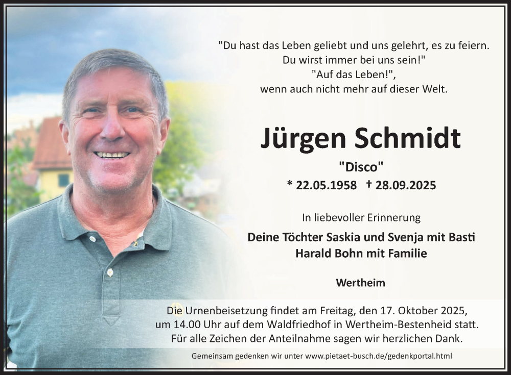 Hier finden Sie alle Traueranzeigen aus der Zeitung, die bisher für Jürgen Schmidt erschienen sind. Weitere Traueranzeigen, die in der Zeitung erscheinen, werden hier ebenfalls aufgelistet