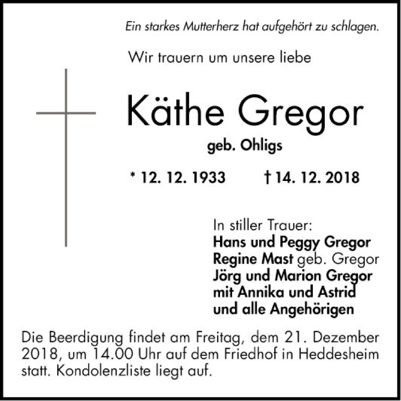 Hier finden Sie alle Traueranzeigen aus der Zeitung, die bisher für Käthe Gregor erschienen sind. Weitere Traueranzeigen, die in der Zeitung erscheinen, werden hier ebenfalls aufgelistet