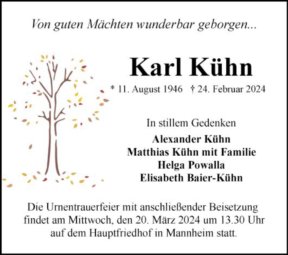 Hier finden Sie alle Traueranzeigen aus der Zeitung, die bisher für Karl Kühn erschienen sind. Weitere Traueranzeigen, die in der Zeitung erscheinen, werden hier ebenfalls aufgelistet