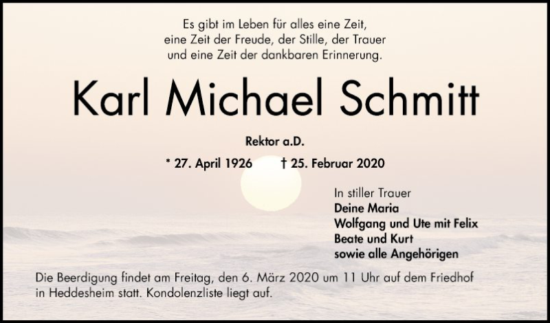 Hier finden Sie alle Traueranzeigen aus der Zeitung, die bisher für Karl Michael Schmitt erschienen sind. Weitere Traueranzeigen, die in der Zeitung erscheinen, werden hier ebenfalls aufgelistet