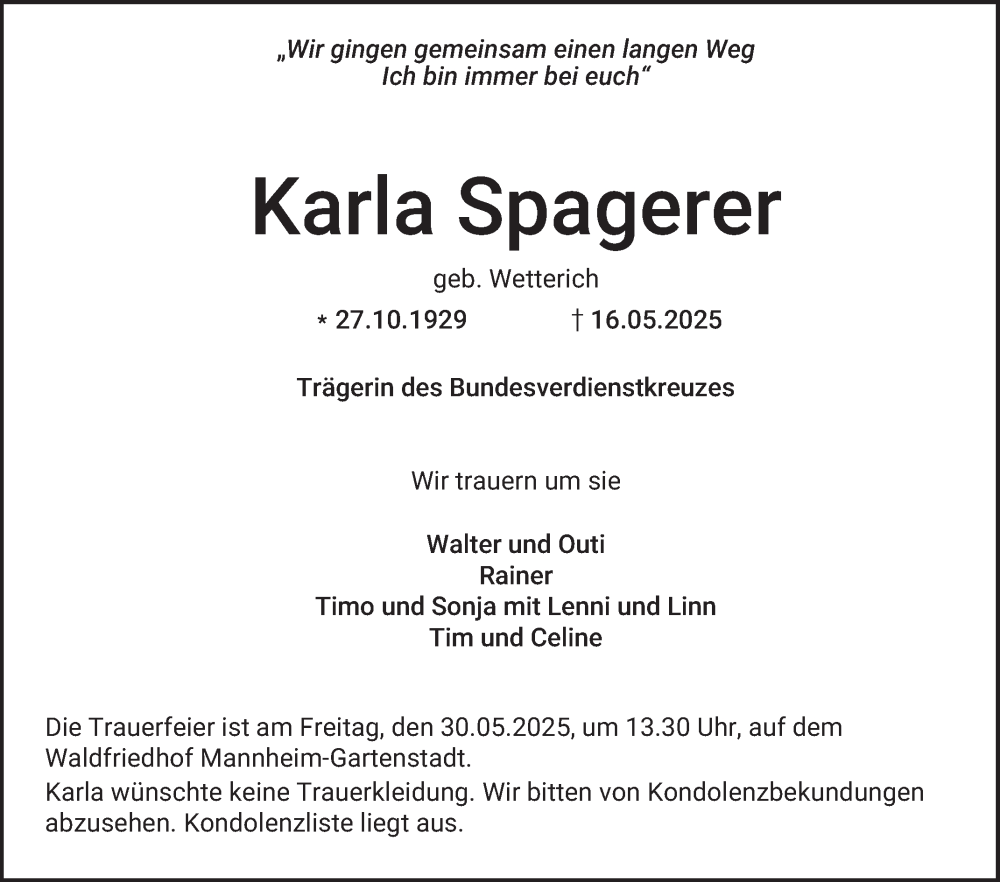 Hier finden Sie alle Traueranzeigen aus der Zeitung, die bisher für Karla Spagerer erschienen sind. Weitere Traueranzeigen, die in der Zeitung erscheinen, werden hier ebenfalls aufgelistet